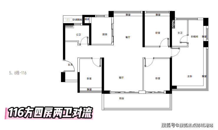 116㎡四房两厅两卫:与115㎡户型镜像,高层采光较好,但北侧部分房间可能受1栋遮挡,低层主阳台对学校。
