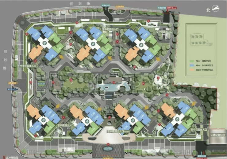 项目二期「文荟」共7栋,约1716套,户型包括建面约78 - 96 - 122㎡三至四房。其中,78㎡三房两卫建面使用率高达115% - 121%(套内使用率144 - 152%),使用面积约90 - 95㎡,超越了周边一些大面积户型的使用空间;96㎡3 + X房两卫建面使用率高达110% - 118%(套内使用率138 - 148%),使用面积约111 - 115㎡,与周边143㎡四房使用面积相当;122㎡4 + X房两卫建面使用率高达约118%(套内使用率148%),使用面积约142㎡,超越了周边169㎡四房的使用面积。
