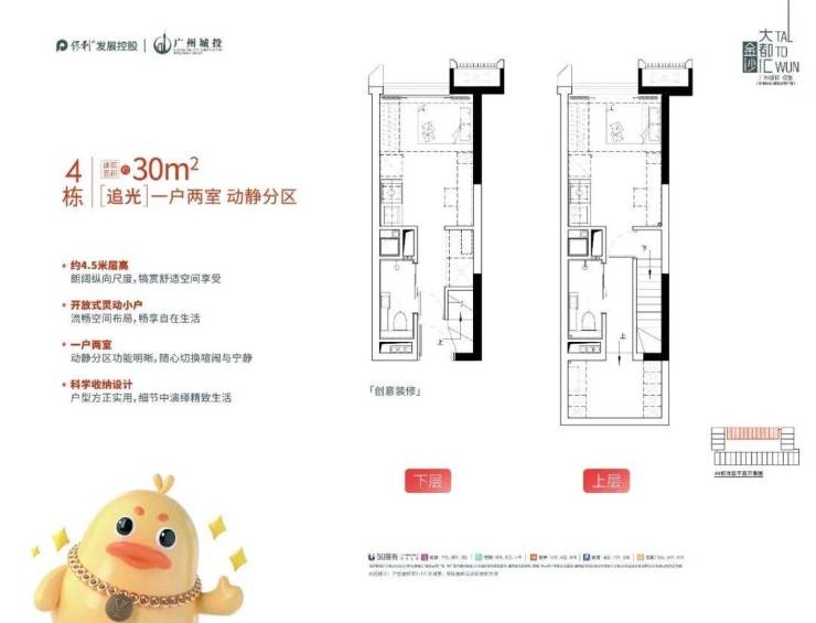 目前在售的户型主要有三个主力户型,分别是建面30㎡、35㎡、42㎡,全都是双钥匙复式设计,4.5米层高,精装修交付,具体户型特点如下:
