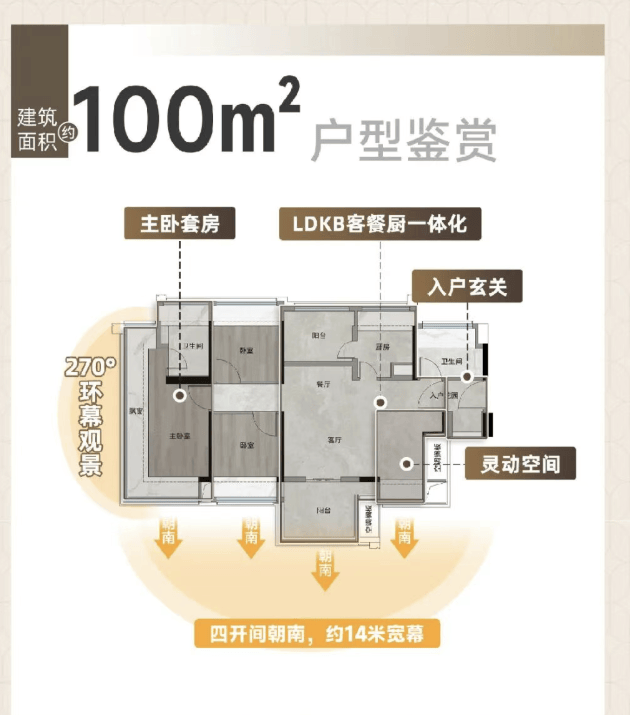 建面约100㎡四房:全南向、双卫、大阳台,使用率约 100%。