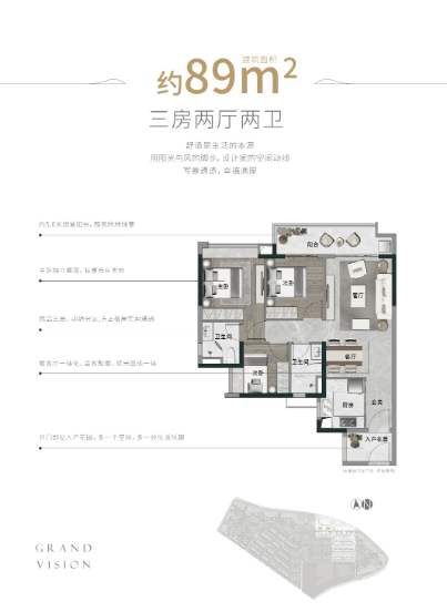 建面约89㎡至168㎡阔景三至五房:南北对流设计,动静分区合理,实用率高。