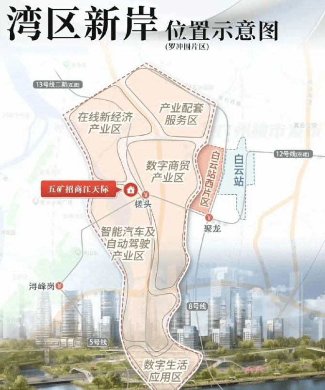 白云湾区新岸板块是广州未来发展的重点区域之一,官方已将大量资源集中于此,包括规划中的华为广州研发中心等重大项目。该区域不仅有着独特的自然景观优势,如珠江前、后航道以及未来的滨江高质量发展示范带,而且在政策支持下,产业和商业配套正在逐步完善,具有极高的发展潜力。