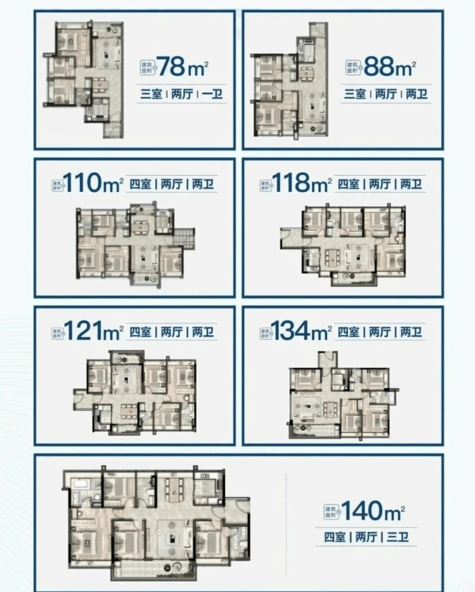 目前,五矿招商江天际主推的户型面积涵盖78至140平方米,包括三房和四房户型,满足不同家庭的需求。项目均价大约为4万元/平方米,且越大的户型单价越高。值得注意的是,尽管价格较高,但考虑到其一线江景资源和优越的地理位置,性价比仍然突出。
