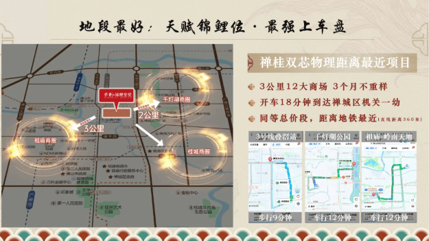 熟悉佛山的人都知道,祖庙街道是禅城的核心腹地,是佛山政治、文化、商业的聚集地,这里拥有不可复制的历史文脉与成熟配套,近10年祖庙中心仅出让4宗商住地,新盘供不应求,稀缺性不言而喻。而千灯湖CBD则是佛山的金融中心、高端商务区,汇聚了众多企业总部、高端商业配套,是佛山城市形象的封面,也是佛山房价的“风向标”。这个项目恰好地处两者之间,实现了“3个灯位到千灯湖CBD、3公里直达祖庙”的便捷通勤,真正做到了“左手繁华,右手烟火”。