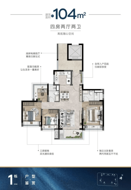 约104平方米四房两厅两卫:紧凑实用,适合小型家庭居住。南北通透,采光充足,每个房间都能享受到阳光。