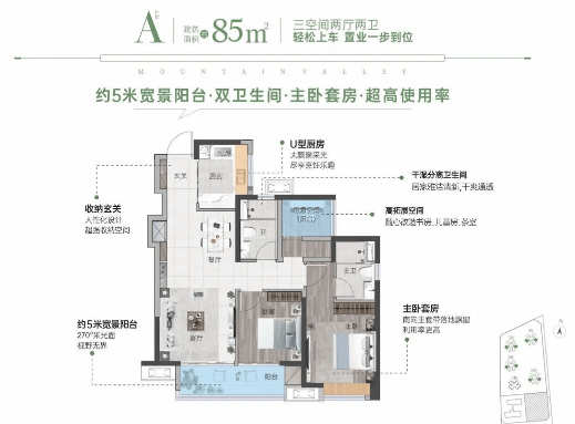 约85㎡三房两厅两卫:南向设计,拥有超宽阳台和超高赠送面积。