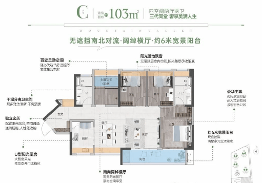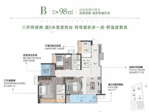 约103㎡四房两厅两卫:南北通透,灵动户型,超大宽景阳台。
