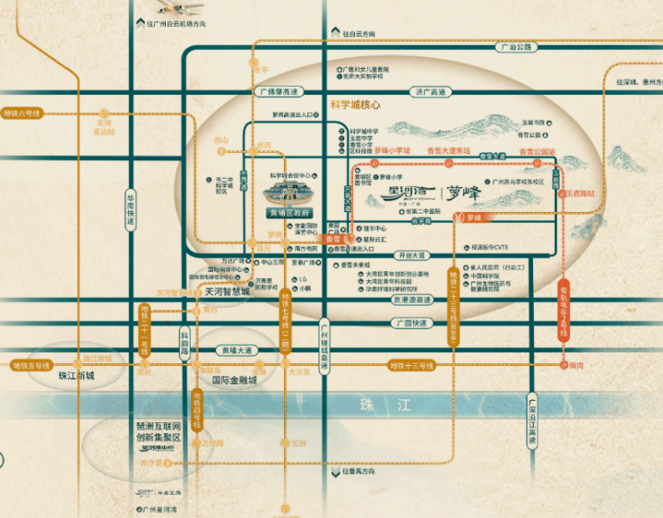 其次,项目周边主干道网络发达。广深沿江高速、广汕公路等高等级道路环绕四周,自驾出行极为便利。无论是前往珠江新城,还是通往白云机场、深圳方向,都能实现快速通达。特别是广深沿江高速的开通,进一步拉近了科学城与珠三角其他城市的时空距离,为商务出行和周末休闲提供了更多选择。