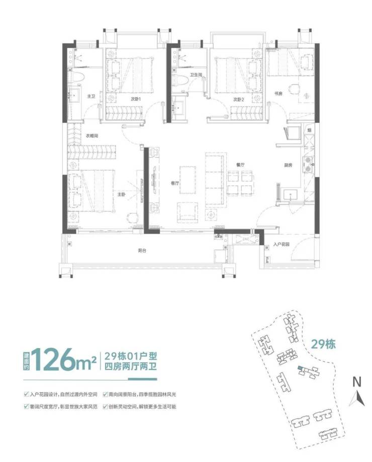 100㎡四房:7.3米面宽,270°观景视野,主卧套房设计,满足三代同堂需求。总价600万起,适配改善型家庭(数据来源:项目户型图及实测数据)。