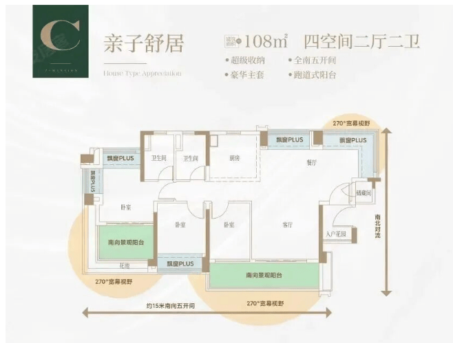 四/五开间朝南设计:主卧套房标配270°环幕飘窗,提升居住舒适度。