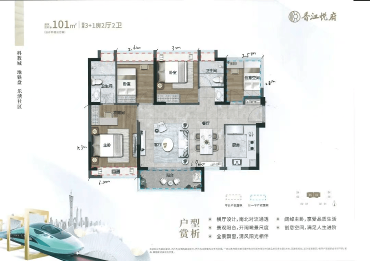 101㎡3+1 房 2 卫采用南北通透的横厅设计,无纯交通面积浪费,空间开扬且采光通风俱佳。相较于周边同类型 95-96㎡户型,该户型在卧室尺度上优势明显,主卧面宽 3.2 米,次卧分别为 3 米和 2.6 米,多功能房面宽 2.5 米,在总价相近的情况下,为改善型购房者提供更高舒适度的居住选择。