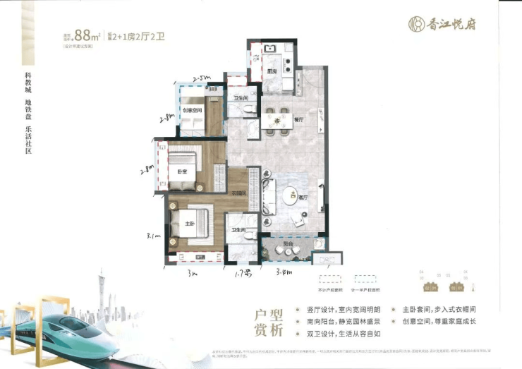 88㎡2+1 房 2 卫是项目主力户型,2.5 开间朝南设计,南向单元无高层遮挡,视野开阔且采光充足。客厅开间 3.4 米,净宽超 3.2 米,主卧面宽 3 米,即使是多功能房也保持 2.8*2.5 米的舒适尺度,动区与静区合理划分,完美适配三代同堂或五口之家的过渡型居住需求。