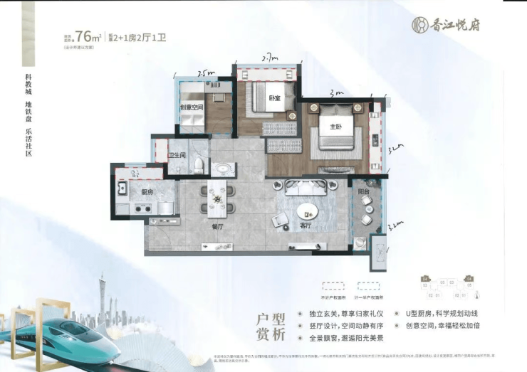 76㎡2+1 房 1 卫作为入门级刚需户型,总价 120 万起即可入手。户型虽紧凑但尺度均衡,客厅与主卧开间均达 3.2 米,全景飘窗设计拓宽空间进深 50 公分,多功能房可灵活改造为卧室或书房,实现空间利用率最大化。