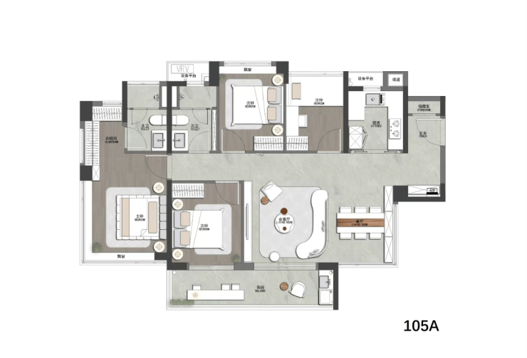 约105㎡真四房:四开间朝南,南向面宽达12.8米,主卧配备270°环幕飘窗与独立衣帽间;