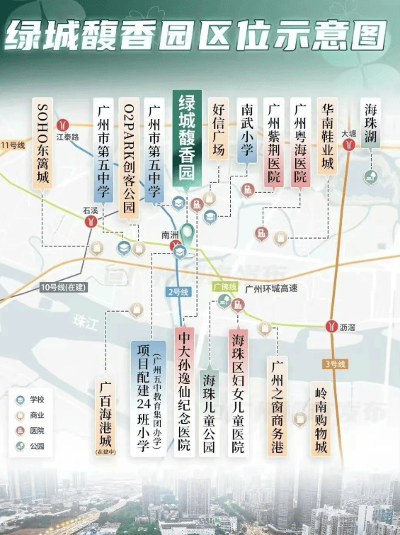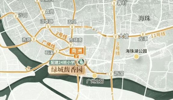 交通是衡量居住价值的重要标尺。绿城馥香园位处广佛线与地铁2号线南洲站双地铁上盖,直线距离仅约100米。从南洲站出发,3站直达客村,5站抵达珠江新城,7站通达琶洲会展核心区,8站覆盖万博、金融城、白鹅潭等新兴商圈,高效串联广州各大经济动脉。