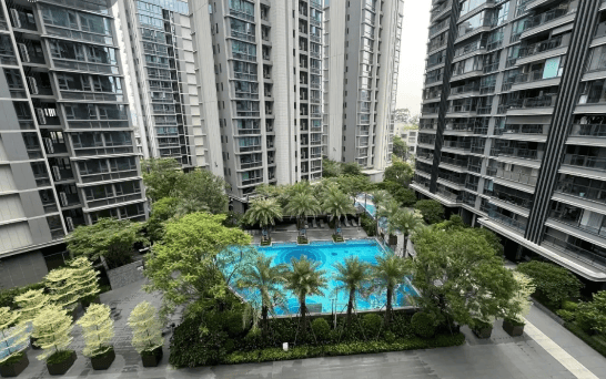 项目由保利发展开发(2023 年中国房地产销售额 TOP1,三道红线全绿),总占地面积 43999㎡,总建筑面积 134000㎡,容积率仅 2.83,绿化率 35%,居住密度远低于同板块超高层项目。规划 21 栋住宅(16 栋 14-16 层小高层、5 栋 4 层临河叠墅)与 1 栋政府统筹用房,总户数 478 户,梯户比为两梯两户(小高层),车位比 1:1.6(共 766 个车位),完全满足业主停车需求。物业公司为保利物业,物业费 6.8 元 /㎡/ 月,专业服务保障居住体验,同时规划 1 所 12 班幼儿园及部分商业、农贸肉菜市场,生活便利性拉满。