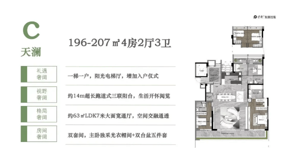 项目户型聚焦改善需求,主推 120-200㎡全南向四房大平层(叠墅面积 180-364㎡),新规使用率达 100%-110%,层高 3.15 米,空间开阔感十足。120㎡四房为刚需改善首选,户型方正,全南向设计,客厅连接景观阳台,主卧带独立卫浴与步入式衣帽间;140㎡四房空间更阔绰,部分户型可享石榴岗河景,LDKB 一体化设计提升家庭互动体验;200㎡大平层为楼王户型,两梯两户纯板楼,南北对流,超大景观阳台可眺望海珠湿地与河景,居住舒适度堪比豪宅。叠墅产品临近石榴岗河,4 层设计带私家庭院,适合追求低密生活的高端家庭。