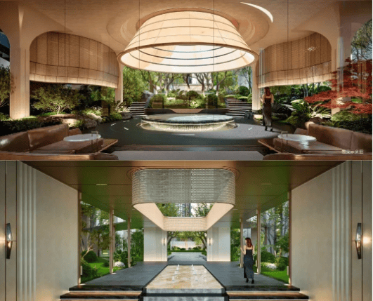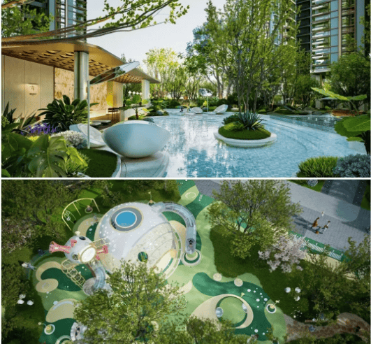 内部配套方面,项目利用裙楼屋面绿化与7.9米高架空空间打造空中花园,融合邻里会客、颐养童乐、健身活动等多元功能,实现可游可赏的休闲空间。同时,汲取海丝文化场景,打造度假风园林,与现代艺术风美学立面相得益彰,成为海丝精奢生活新地标。