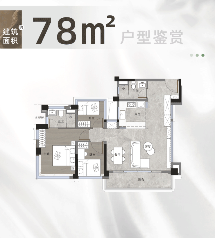 建面约78㎡三房两卫:该户型建面使用率高达115%-121%,套内使用率144-152%,实际使用面积约90-95㎡,超越一路之隔同类项目99㎡三房的使用空间,秒杀市面上绝大多数90㎡以内产品。户型采用四开间朝南设计,搭配大方厅与大阳台,采光通风极佳;全屋满配收纳柜体,高频柜体点位覆盖,最大化利用每一处空间;配备全屋智能系统、中央空调与新风系统,精装标准拉满,适合刚需小家庭。