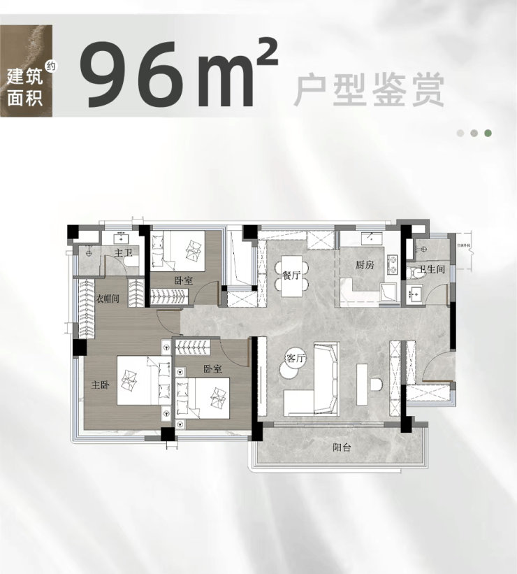 建面约96㎡3+X房两卫:建面使用率110-118%,套内使用率138-148%,使用面积约111-115㎡,与市面110-120㎡三四房产品使用面积相当,甚至媲美同类项目143㎡四房空间。3+X灵动户型设计,可根据家庭需求改造为书房、儿童房或储物间,实用性极强;全系南向布局,大面宽采光,客厅与阳台相连,拓展活动空间;全屋智能与精装配置一应俱全,适合改善型家庭。