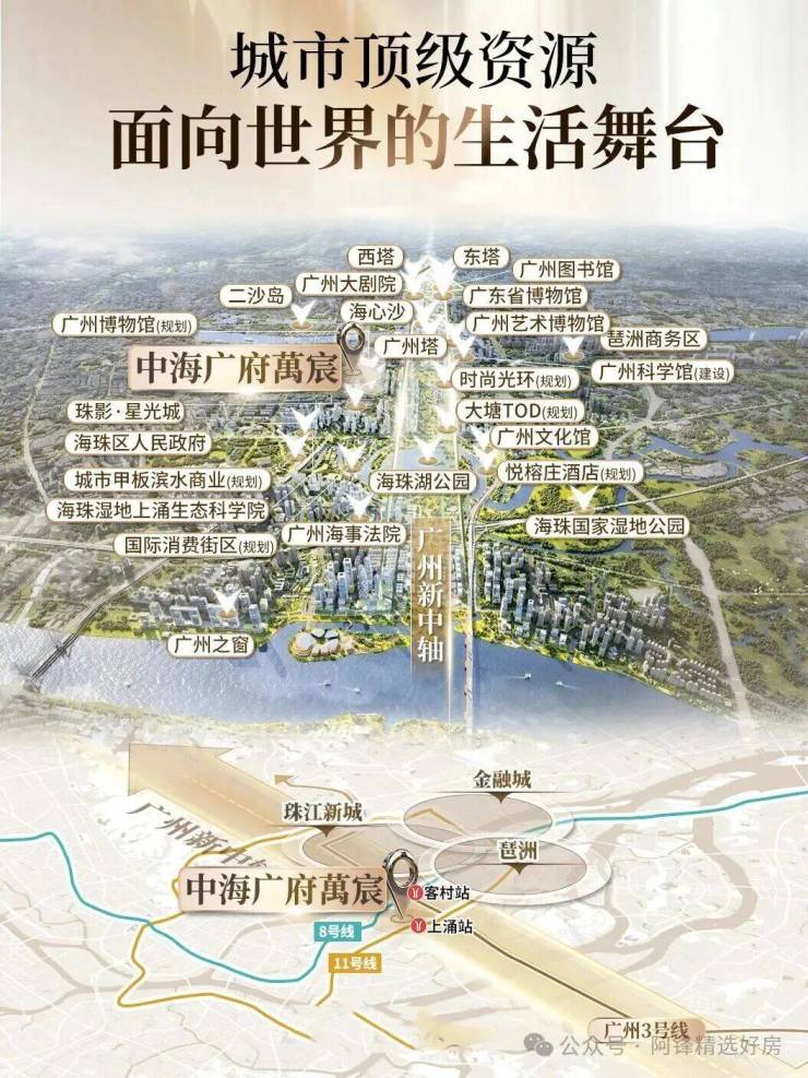 从广州塔至海珠湖,约3公里的黄金脉络,是政府重点打造的“面向世界,人人可享的城央舞台”,这里承载着国际消费、新质生产、生态文旅、科创发展等多重核心功能,正以超前的速度兑现规划蓝图,成为广州城市发展的新引擎。而中海广府萬宸,便坐落于这3公里黄金段的核心,占据中轴圆心位置,轻松执掌整个片区的发展红利