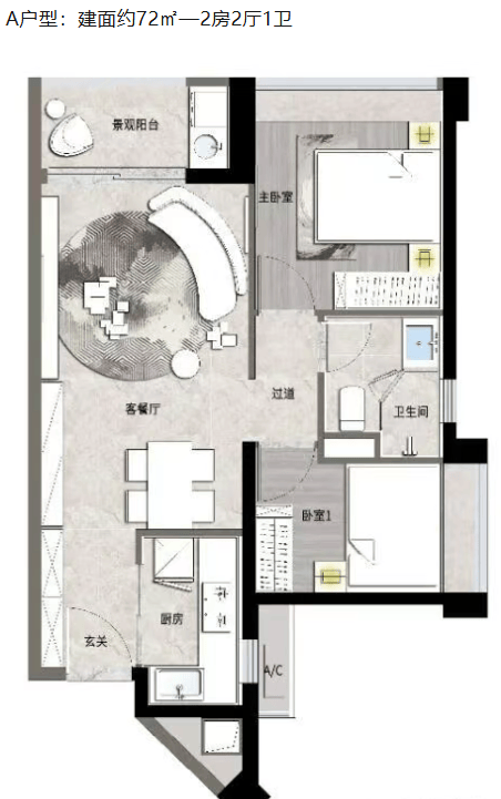 A户型:建面约72㎡—2房2厅1卫:紧凑实用,适合单身人士或小家庭。