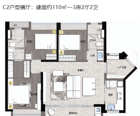 C2户型横厅:建面约110㎡—3房2厅2卫:大开间设计,视野开阔,适合追求高品质生活的家庭。