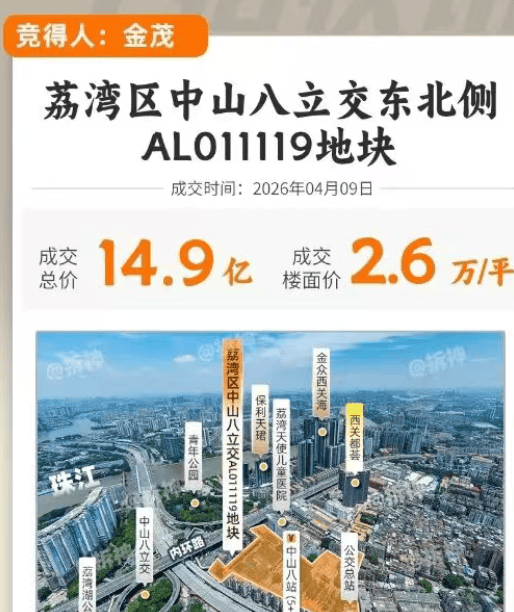 金茂中山八项目位于广州市荔湾区中山八立交东北侧,地处老西关核心腹地,是广州千年文脉的发源地,承载着广府文化的精髓,人文底蕴深厚、生活氛围浓厚、配套成熟完善。地块前身为电车保养场,是老西关稀缺的大体量宅地,历经 10 轮竞价,最终由中国金茂以 14.88 亿元、楼面价 26609 元 /㎡斩获,成为 2026 年广州土拍市场的焦点。