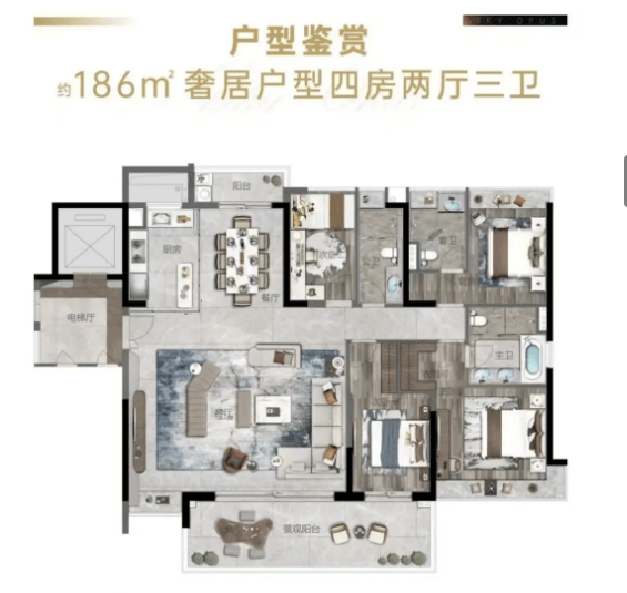 具体户型方面,124㎡户型为三房两厅两卫设计,布局方正,空间利用率高,适合三口之家居住;141㎡户型为四房两厅两卫,南北通透,双阳台设计,满足多人口家庭的居住需求;186㎡大户型为四房两厅三卫,空间宽敞舒适,功能分区明确,配备豪华主卧套间,为业主带来极致的居住体验。