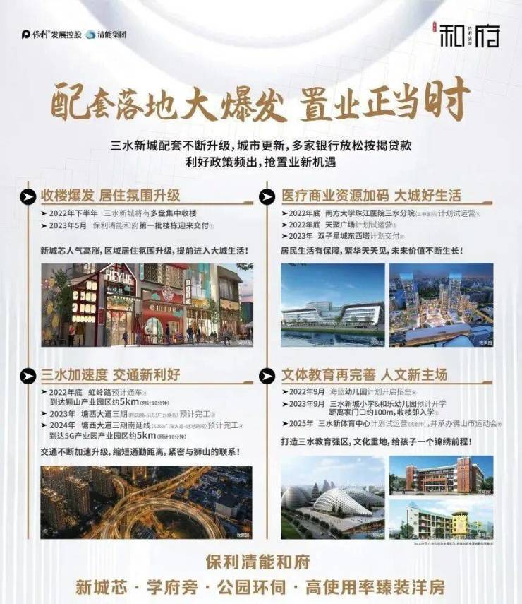 保利清能和府由世界500强央企保利发展与拥有一级开发资质的国企清能集团强强联合打造,两大实力企业联袂发力,凭借雄厚的资金实力、丰富的开发经验与严苛的品质把控,为项目的品质与交付提供了坚实保障,打造三水新城高品质人居标杆。项目整体规划科学合理,建筑风格简约大气,社区环境舒适宜居,目前已有部分业主入住,实景呈现的居住氛围,让置业更具安全感与归属感,彻底规避期房减配、延期风险,实现“即买即住、即买即办证”。