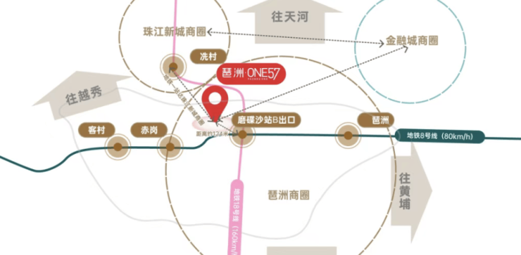 在越秀·琶洲ONE57周边,交通网络四通八达。地铁8号线和18号线磨碟沙地铁站距离项目仅124米,乘坐地铁一站即可到达珠江新城冼村,十几二十分钟就能畅达广州主城区的生活圈。自驾出行也极为便利,项目紧挨新港东路、猎德大道,3分钟即可上华南快速,半小时内就能贯穿广州市中心生活圈。此外,500米内有磨碟沙站、磨碟沙地铁站、海港花园、芳园东路、磨碟沙路站等多个公交车站点,几十条公交车路线可供选择,无论您选择何种出行方式,都能轻松抵达目的地。
