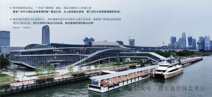 更值得一提的是,项目近距离享受琶洲片区的顶级跨境交通配套。距离项目不远的琶洲港澳客运码头,开通了直达香港、澳门的水上航线,约 2 小时即可直达香港国际机场;同时,海珠(琶洲)低空飞行运营中心已落地布局,约 9 分钟即可直达白云国际机场,约 26 分钟可达香港国际机场,为业主的跨境商务、出行旅游提供了前所未有的便捷体验,轻松接轨国际生活。