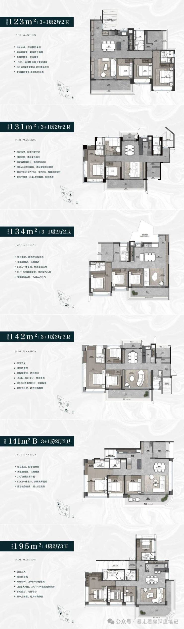 建面约 195㎡的四房两厅三卫户型,是为广州塔尖人群量身打造的顶级改善大平层,专为多孩家庭、三代同堂的高端家庭设计。户型采用双主卧套房设计,两个南向主卧套房均配备独立卫生间与全景飘窗,无论是老人居住,还是主人自住,都能拥有独立、私密、舒适的居住空间,互不干扰。四开间朝南,搭配超宽的环幕观景阳台,270 度直面万亩湿地公园,推窗就是无边无际的自然绿意,将城市稀缺的生态景观资源尽收眼底。LDKG 一体化的超大方厅,搭配独立的中西双厨与餐厅,可轻松容纳十几人的家庭聚会与商务宴请,尽显主人的气度与格调。同时,户型配备了独立的入户玄关、多功能空间、家政空间,从细节处满足高端家庭的全维度居住需求,打造出匹配塔尖身份的顶级人居体验。