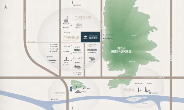 伟大的藏品,源于对土地战略价值与稀缺景观资源的绝对占有。中国铁建西派云峰的占位,是一次对广州北部新都心发展核心与顶级自然资产的“战略性制高点”占领。项目雄踞于白云新城中央商务区(CBD)的东部门户,坐落在被誉为“广州国宾道”的白云大道之畔。这条大道不仅是连接白云山与珠江新城的城市中轴脉络,更是广州面向世界的迎宾大道与形象窗口。在项目约3公里的黄金半径内,汇聚了广东省画院、广州体育馆、白云国际会议中心、广州市儿童活动中心等省市顶级文化公建,以及中国南方航空、广东省机场管理集团、华为广州研发中心等巨擘总部,共同构成了一个“千亿级”的政经文旅资源聚合体,赋予了此地无与伦比的城市话语权与昭示性。