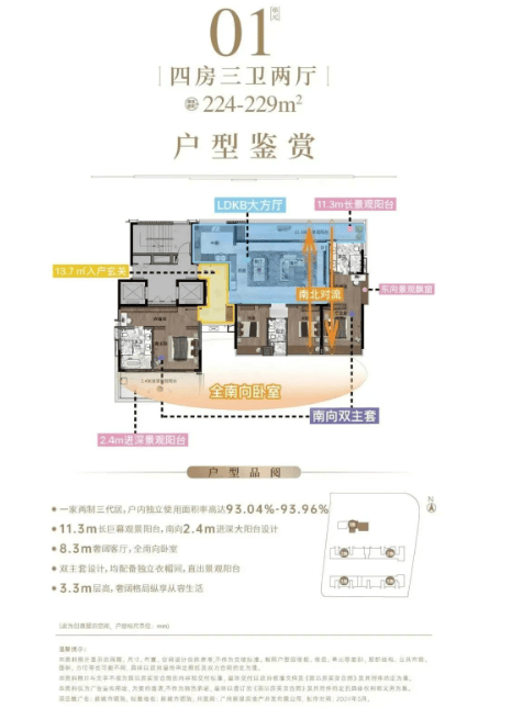 小高层(16楼),2梯2户板式设计,3.3米层高,户型最小面积为130平方米三房,最大面积为224-229平方米四房。