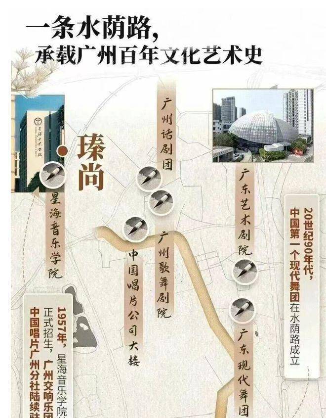 深厚文化底蕴:项目南端的水荫路自上个世纪 70 年代便刻下文化基因,孕育了《花城》《诗歌与人》等知名刊物,90 年代诞生中国第一个现代舞团。如今,短短 1 公里集聚广州歌舞剧院、星海音乐学院等数十家文化机构和上百位艺术人群,是广州文化艺术起点,其百年沉淀的文化艺术根基无法复制。