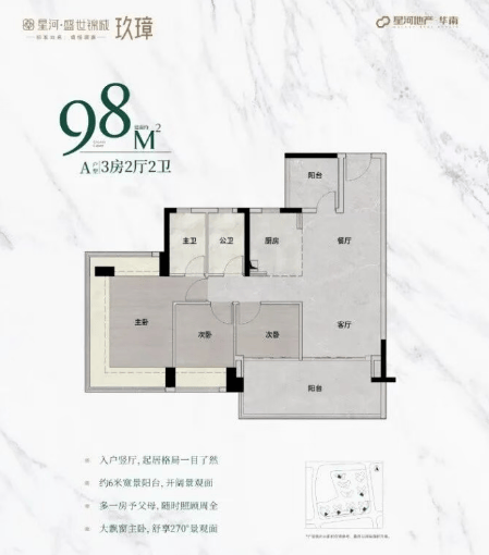 98㎡户型:主朝向朝南,让阳光洒满每一个角落。主卧配备270°无柱飘窗,视野开阔,美景尽收。次卧和阳台尺度大幅增加,提供更加舒适的居住体验。