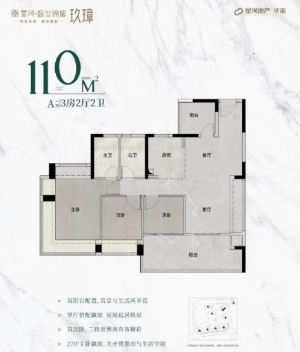 110㎡户型:主朝向西南,带来充足的采光和通风。客厅、阳台和主卧尺度全面超越二期,空间更加开阔大气,彰显尊贵风范。