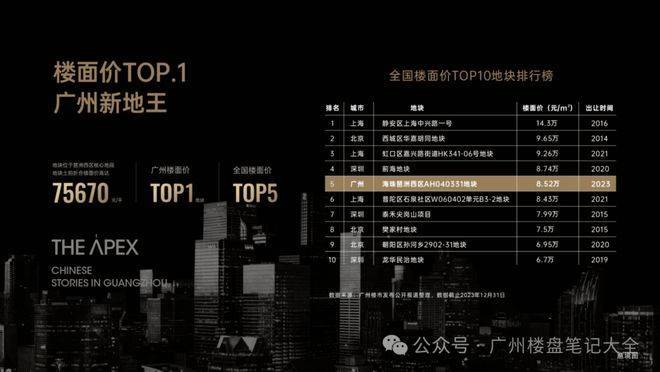 (地块价值高度)2023年12月29日,越秀地产历经85轮激烈竞价拿下琶洲·樾|华樾所属地块,75670元/㎡的楼面地价刷新广州地价纪录,位列广州楼面地价第1位、全国楼面地价第5位,地块稀缺性与价值高度不言而喻。作为琶洲CBD核心宅地,其土地价值依托区域发展红利持续攀升,也奠定了项目顶豪定位的基础,成为广州高端住宅市场的标杆级地块,也让项目从诞生之初便具备不可复制的资产属性。
