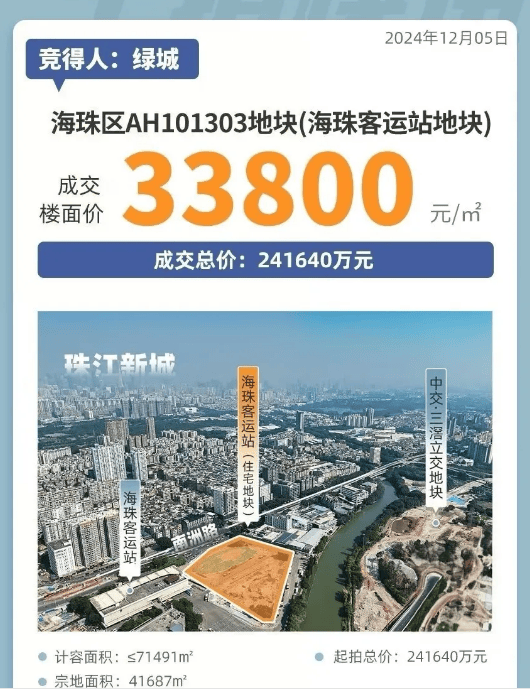 绿城馥香园的开发始于2024年12月5日,绿城以总价24.16亿元拿下海珠客运站地块,楼面价3.38万/平(未扣除配建),这是绿城自2014年拿下广钢地块后,再次布局广州中心区的重要举措。项目总占地面积约4.17万㎡,总建筑面积约11.66万㎡,容积率仅3.86,规划建设5栋32层全南向高层洋房,整体定位为城央低密精品住区,避免了高楼林立带来的压抑感,为业主提供更舒适的居住体验。