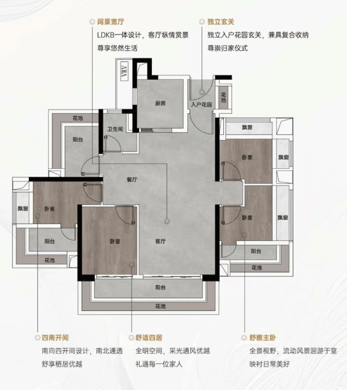 建面102㎡四房两厅两卫采用飞机户型设计,南向朝阳面宽阔,保证室内通透采光,LDKB一体化设计打造阔绰会客空间,满足家庭聚会、宴请宾客需求。户型外围环绕花池与飘窗,赠送面积充足,进一步提升空间利用率,各卧室布局合理,私密性强,适合改善型家庭。