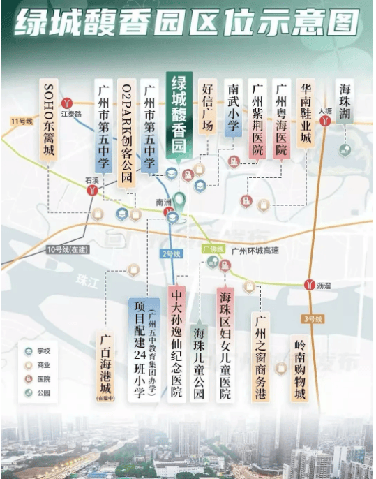 绿城馥香园坐落于海珠湾心核心区位,遥望广州塔、海心沙等城市地标,占据广州中轴地段的稀缺资源,周边商圈环绕、配套成熟,是海珠区宜居宜业的优质板块。项目最大的交通优势的是双地铁上盖,紧邻地铁2号线与广佛线换乘站南洲站,直线距离仅约100米,从南洲站C1口出站即可便捷抵达项目周边。