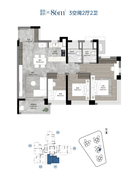 建面约 86㎡三房两厅一卫:刚需主力户型,紧凑实用,独立玄关 + 双轴线通风设计,收纳空间充足。