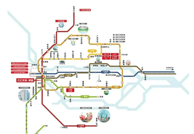 项目紧邻 花地湾TOD枢纽,属于 地铁1号线、25号线 换乘站,距离地铁站约 800米,步行约 12分钟。1号线直达芳村TOD,可换乘 11号线(环线) 和 22号线(快线),实现“一站换三线”,极大提升出行效率。