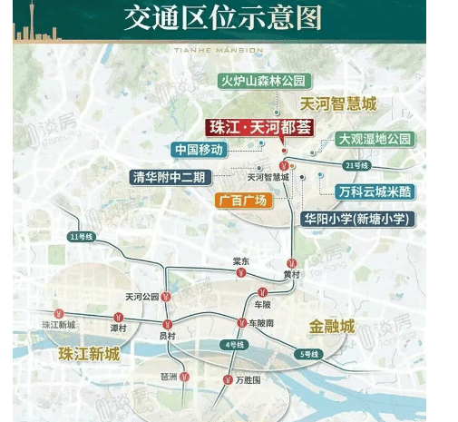 天河都荟距离地铁21号线天河智慧城站仅约600米,步行大约需要8到10分钟,使得通勤变得异常方便。通过21号线,居民可以快速到达金融城和珠江新城等主要工作区域。此外,周边公交网络发达,1公里范围内设有多个公交站点,极大地提高了出行的便利性。对于经常出差的人来说,广佛城际环线岑村站也提供了直达白云机场和广州南站的服务。