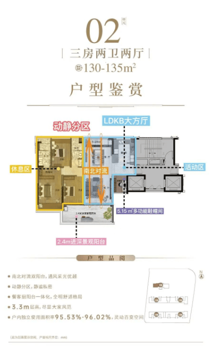 130㎡三房两厅两卫:最小户型,适合刚需家庭。