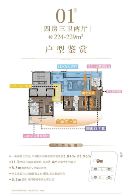 224-229㎡四房两厅三卫:最大户型,提供宽敞舒适的居住空间。