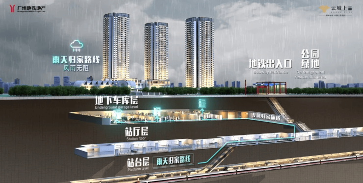 答:项目临近的白云城市中心站预计 2026 年 6 月正式通车,该站为 18/22 号线双线交汇站。项目规划有专属归家通道,业主可从地下车库直接步入地铁站厅,实现无缝衔接。