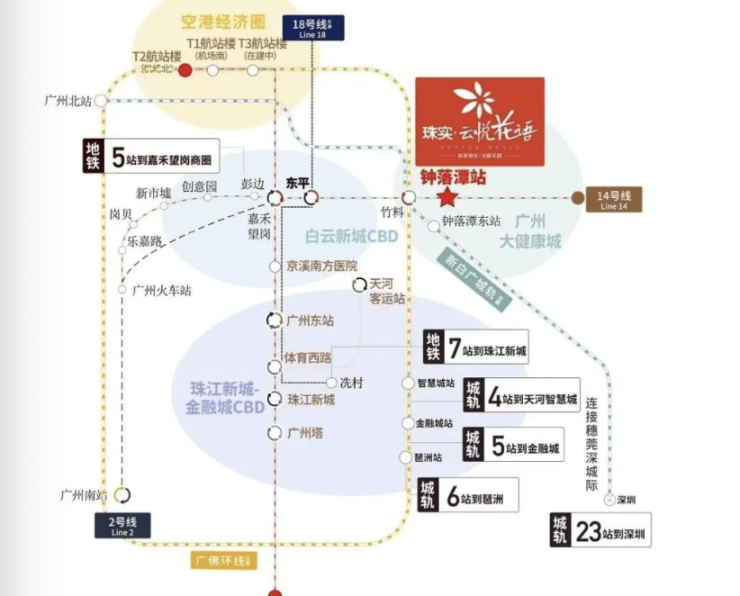 对于选择新兴板块的家庭而言,交通规划的前瞻性与兑现潜力,是评估其远期价值与生活便利度的核心指标。珠实·云悦花语所在的钟落潭板块,在轨道交通层面拥有令人瞩目的“远期蓝图”,正处于“现状有基础,未来有飞跃”的蓄力期。现状基础:项目距离已开通的地铁14号线钟落潭站约800米,通过14号线可在5站内抵达嘉禾望岗枢纽,换乘2、3号线后,可较为顺畅地连接白云新城、机场、广州火车站及中心城区,为当前的通勤提供了基础的轨道解决方案。