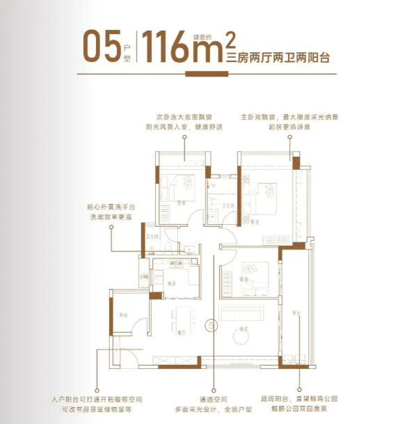 110㎡户型主朝向西南,带来充足的采光和通风。客厅、阳台和主卧尺度全面超越二期,空间更加开阔大气。宽敞的客厅是与家人共享欢乐时光的温馨港湾,舒适的主卧则为打造专属的私密空间提供了可能。